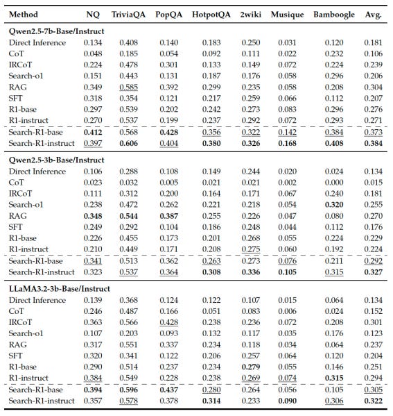 The researchers fine-tuned base and instruct versions of Qwen-2.5 and Llama-3.2 on SEARCH-R1 and evaluated them on reasoning tasks requiring single-turn and multi-hop search against direct inference with Chain-of-Thought (CoT) reasoning with R1, RAG, and supervised fine-tuning for tool use.
