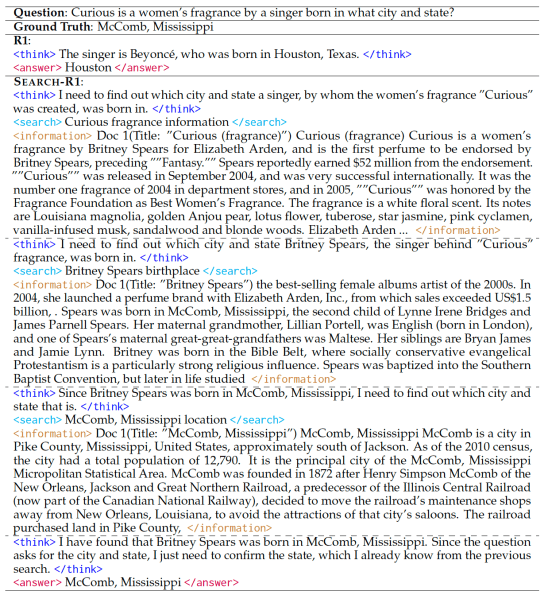 SEARCH-R1 integrates the search into the reasoning process instead of relying on an isolated retrieval stage. Basically, a model trained on SEARCH-R1 works in the following fashion: