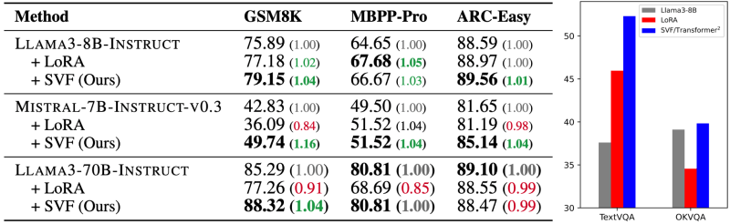 In their experiments, the researchers compared Transformer-squared to LoRA on various tasks, including math, coding, reasoning, and visual question-answering. Transformer-squared outperforms LoRA on all benchmarks with fewer parameters with the added benefit of being adjustable at inference time.