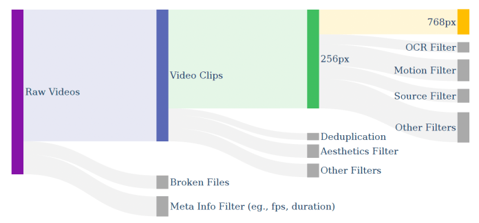 To curate the training dataset, they developed a hierarchical data pyramid to create suitable training examples for each stage of training. They first preprocess the raw videos by removing short and low-quality videos and segmenting the remaining videos into clips suitable for training the model. They then apply a set of filters to remove low-quality segments, (e.g., are too fast or slow, contain too much text, are blurry, or have camera jitters).