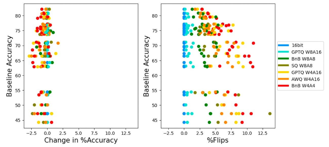 The main driver of this change is what the researchers call “flips,” where the model changes its answers, some from correct to incorrect and vice versa. This is why the overall accuracy measure remains similar. But if the goal of a compressed LLM is to reproduce the behavior of the base model, then flips can have a substantial effect on their performance, especially on generative tasks that require free-form responses.