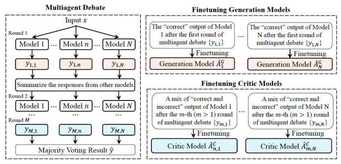 To improve performance, the new technique uses the concept of multiagent debate, where several LLM agents draft and refine responses together. Instead of fine-tuning a single model, the framework uses the same debate and refinement framework to generate diverse datasets and fine-tune multiple models. The models are derived from the same base model and each is trained to specialize in certain parts of the target task.