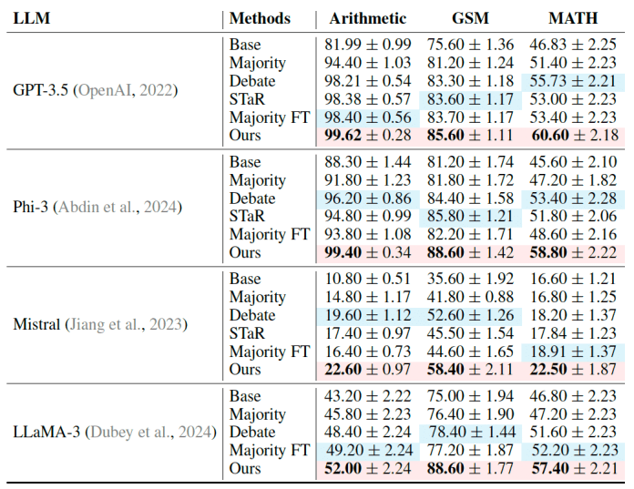 The researchers tested the approach on several reasoning benchmarks for arithmetic, grade-school math, and competition-level math problems. They used it with open source models (Mistral 7B, Llama 3-8B, and Phi 3-4B) as well as GPT-3.5. Since multiagent debate and fine-tuning does not require access to the internal weights of the models, it was applicable both to open and closed models.
