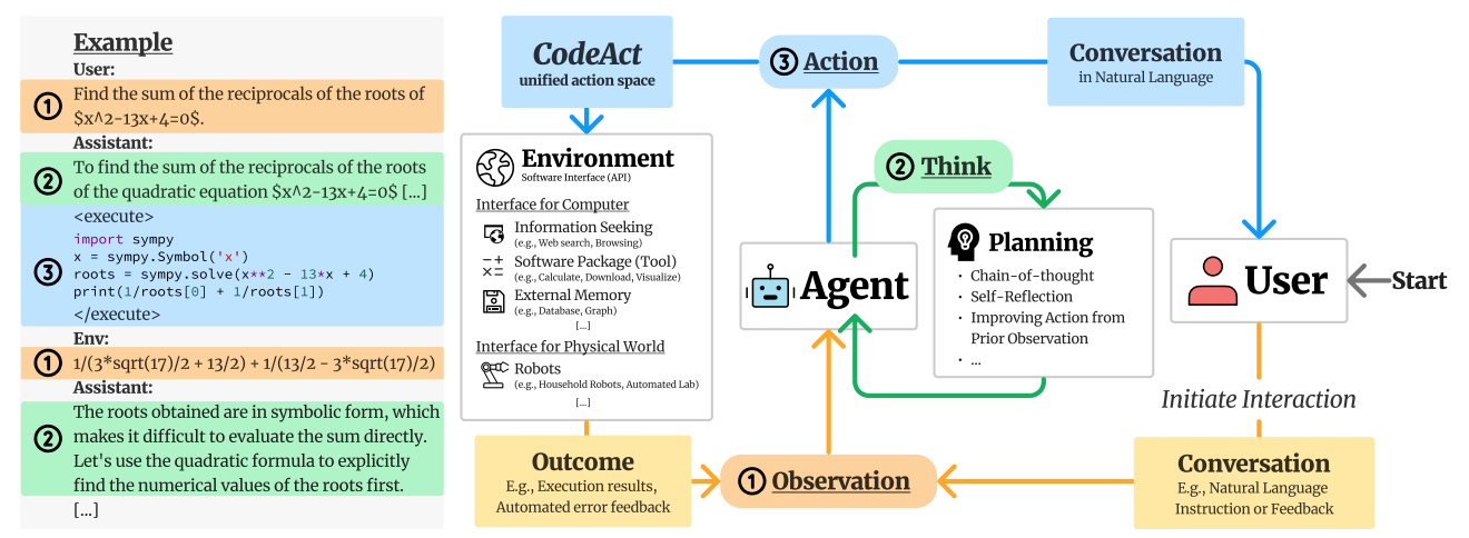 In 2024, the focus shifted to executable environments. CodeAct (Feb 2024) by University of Illinois Urbana-Champaign and Apple replaced text APIs with executable Python code, using execution success as a training signal. The model was trained using direct execution feedback (success/failure signals) from a code sandbox, integrating the results in its reasoning chain and grounding its learning in verifiable outcomes. This set the stage for more complex agentic tasks.
