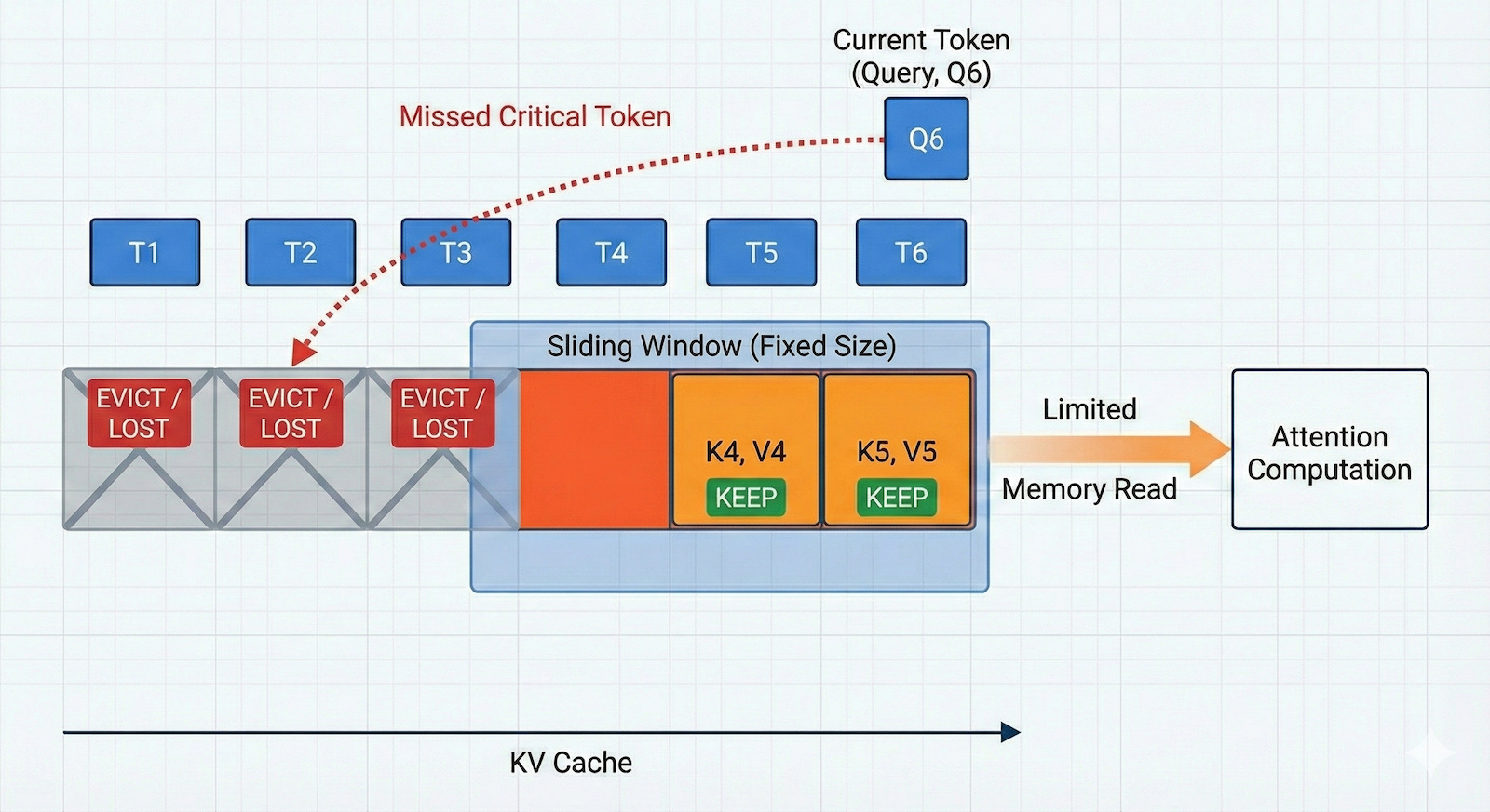 Another method, Query-Aware Sparsity (Quest), keeps the cache but tries to retrieve only the most relevant blocks from memory. It groups tokens into fixed-size pages (e.g., blocks of 16 tokens). During the generation step, it uses a heuristic to estimate which specific pages contain relevant information for the current token being generated. It then copies only those pages from the GPU’s memory (HBM) to faster on-chip memory (SRAM). This makes it possible to better manage the scarce and expensive high-speed memory. Because the attention bottleneck is usually caused by moving data from memory to the chip, Quest speeds up generation significantly by moving less data. However, it does not solve “Out of Memory” (OOM) errors. In fact, Quest creates a slight memory overhead because it has to store additional metadata to manage the pages.