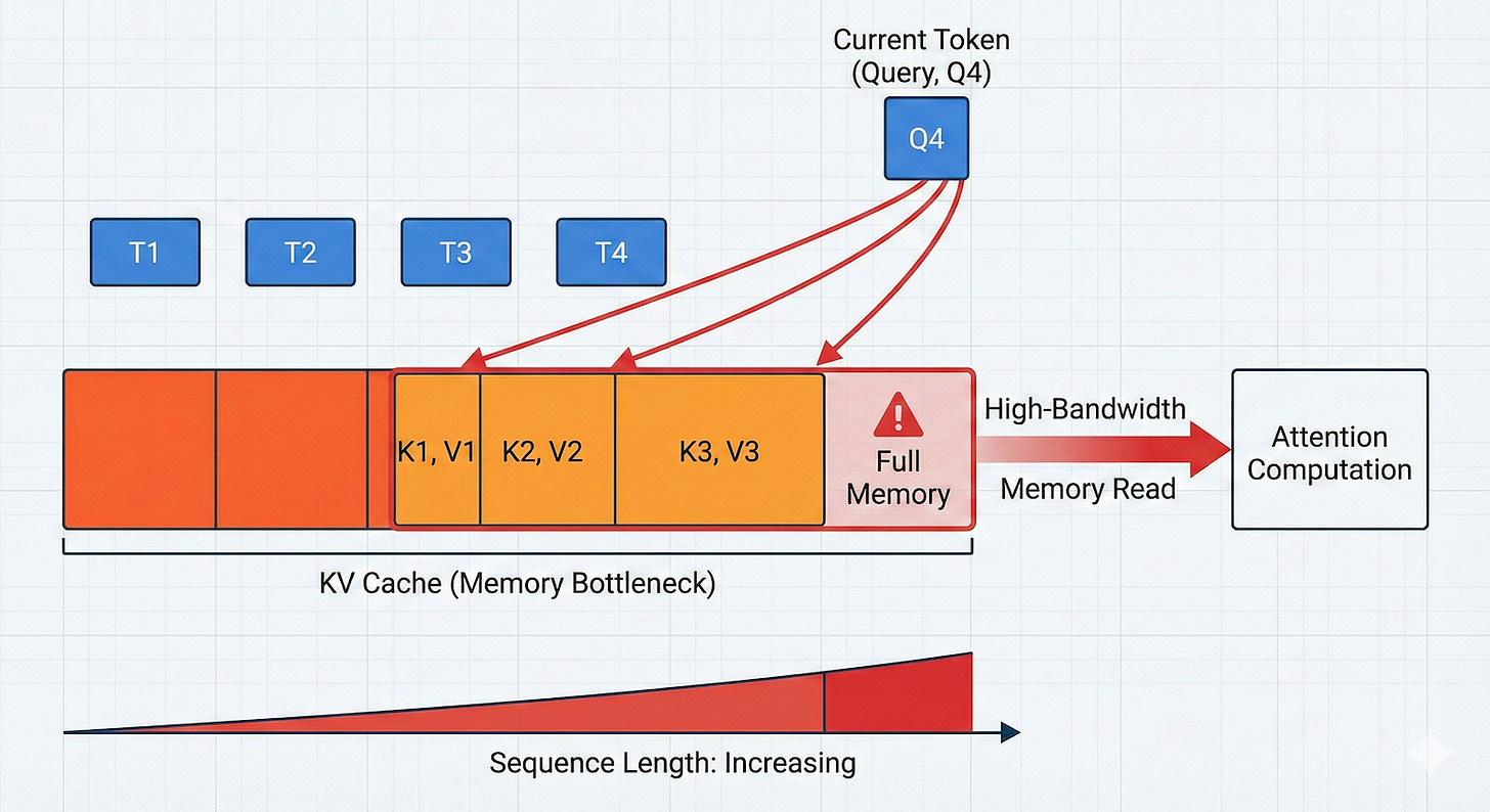 But compute is only part of it. The KV cache grows linearly with the number of generated tokens, it sits in GPU VRAM, and reading it from high-bandwidth memory can dominate runtime during generation. At larger sequence lengths and batch sizes, the latency contribution from KV cache reads becomes the dominant term. That is why long prompts and long outputs slow systems down even when the model architecture itself has not changed.