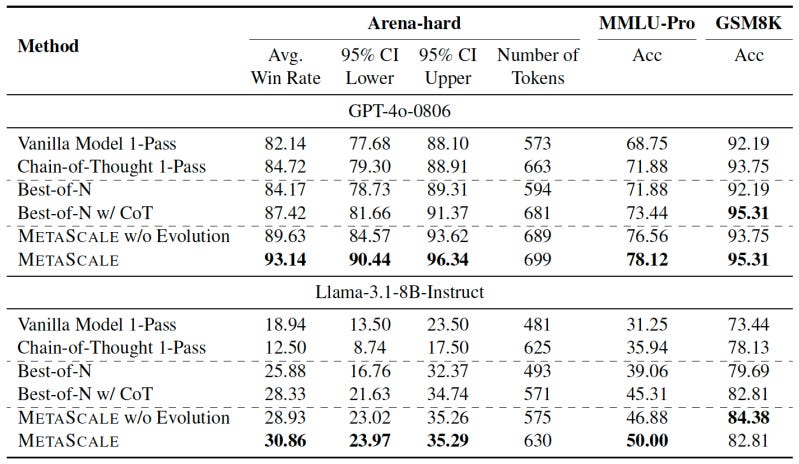 The researchers tested METASCALE on multiple benchmarks, including GSM8K, MMLU-Pro, and Arena-Hard, using GPT-4o and Llama-3.1-8B-Instruct as the backbone LLM. They compared it to four baseline inference methods: direct responses with 1-pass inference, classic chain-of-thought, Best-of-N, and Best-of-N with CoT.