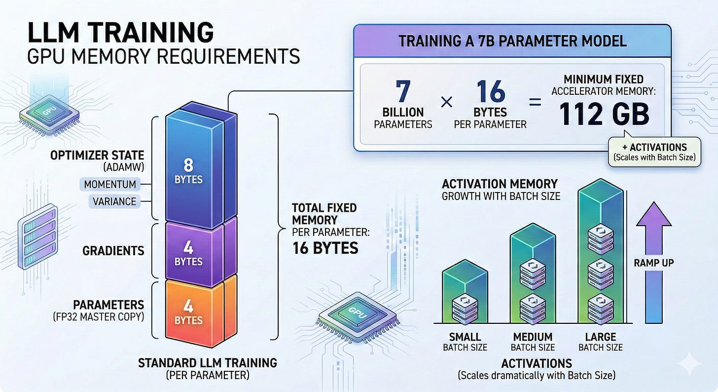 When you combine the parameters, gradients, and optimizer states, a standard training setup using Adam demands roughly 16 bytes of memory for every single parameter. This means if a developer wants to train a 7-billion parameter language model, they must provision at least 112 gigabytes of accelerator memory purely to hold the model and its optimization variables. That calculation does not even include the extra memory needed to process the data batches.