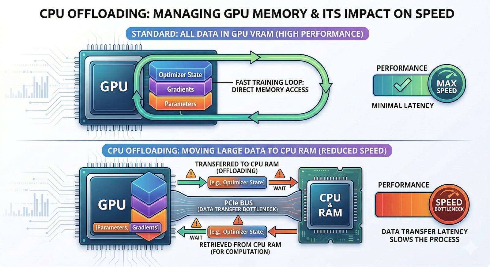 Another alternative is CPU offloading. GPU memory is expensive and scarce, but host system memory is relatively cheap and abundant. Offloading techniques temporarily move certain memory-hungry tensors out of the GPU and into the host machine’s RAM, pulling them back only when the accelerator needs them for a specific calculation. The downside is that moving gigabytes of data back and forth over a PCIe bus creates a massive communication bottleneck. This shuffling introduces added overhead and complexity that ultimately slows down the training loop.