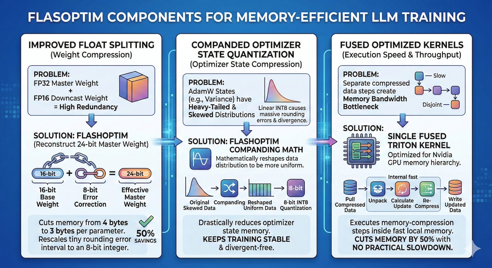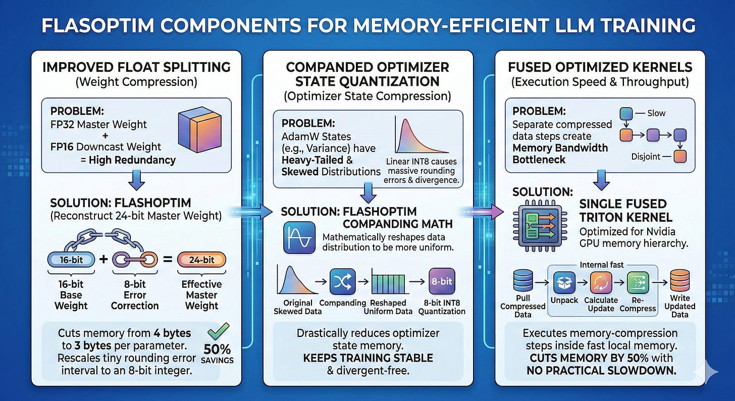 The Databricks researchers took a different route, building FlashOptim as a set of techniques to compress parameter-associated memory directly within common deep learning optimizers. FlashOptim achieves this through improved float splitting, companded optimizer state quantization, and fused optimized kernels.