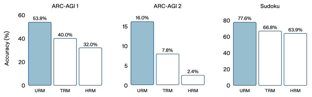The combination of these architectural changes resulted in substantial performance gains over prior UT-based approaches. On the ARC-AGI 1 benchmark, URM achieved a 53.8% on a single run (pass@1), significantly outperforming TRM (40.0%) and HRM (34.4%). URM took an even bigger lead on ARC-AGI 2, where it obtained 16.0% pass@1, nearly tripling the score of HRM and more than doubling TRM. It had a similar advantage on the Sudoku benchmark, reaching 77.6% accuracy.