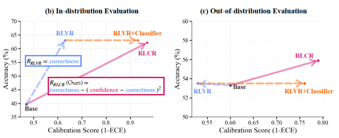 The researchers evaluated how RLCR changes model accuracy and calibration on both in-domain tasks (the same kind used for training) and out-of-domain tasks (new types of problems). They compared RLCR against several baselines, including a base pre-trained model, the standard RLVR method, and RLVR combined with a separate classifier trained just to predict confidence.