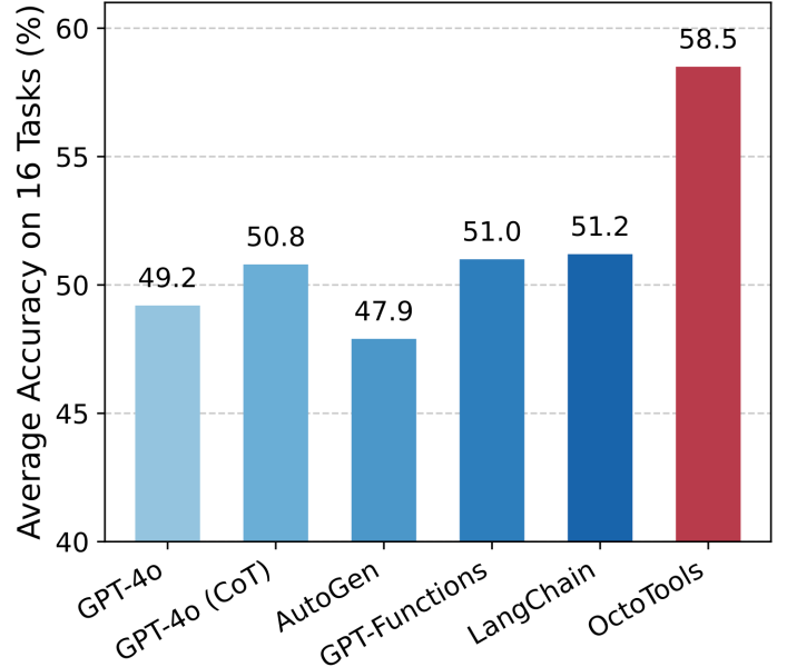 OctoTools achieved an average accuracy gain of 10.6% over AutoGen, 7.5% over GPT-Functions, and 7.3% over LangChain when using the same toolset in different benchmarks, including visual, mathematical, and scientific reasoning; agentic tasks, and medical knowledge . According to the researchers, the reason for OctoTools’ better performance is its superior tool usage distribution and the proper decomposition of the query into subgoals.