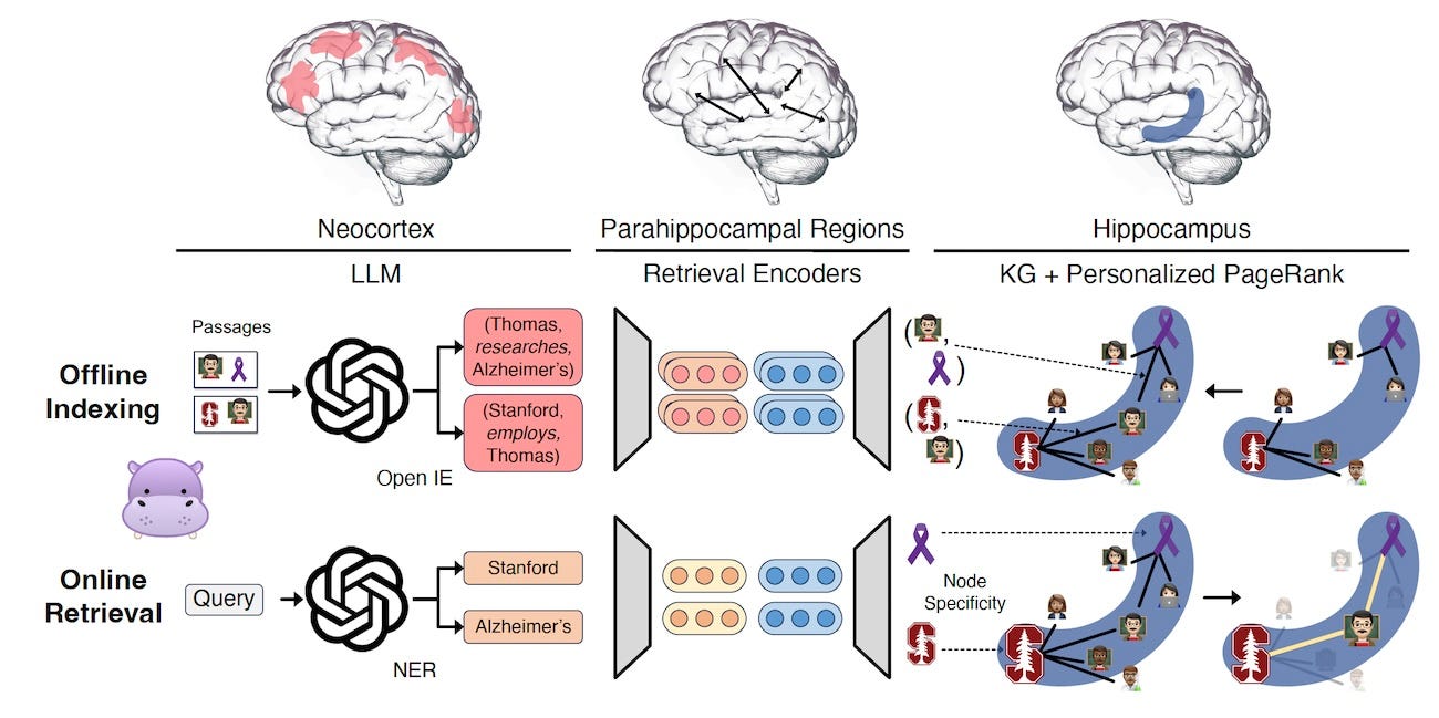 HippoRAG takes inspiration from the biological interactions between the neocortex and the hippocampus that enable the powerful context-based, continually updating memory of the human brain.